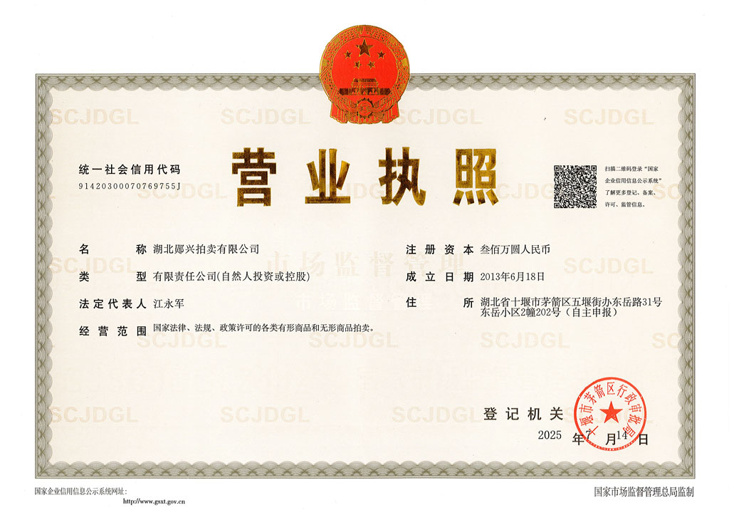 湖北鄖興拍賣有限公司是經(jīng)湖北省拍賣業(yè)主管部門批準(zhǔn),在湖北省工商行政管理部門注冊,具有法人資格的綜合性一級拍賣企業(yè)。